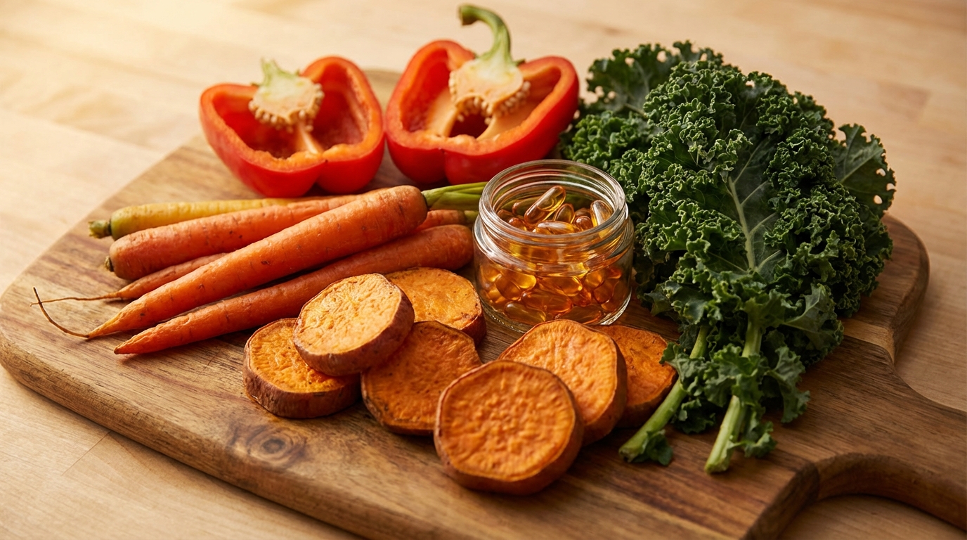 Provitamin A carotenoids are plant-based pigments that your body can convert into retinol. Beta-carotene is the most abundant and efficiently converted of these. It is found in orange and yellow vegetables (carrots, sweet potatoes, pumpkin), dark leafy greens (spinach, kale), and certain fruits (mango, cantaloupe). The conversion is regulated by your body — when you already have enough vitamin A, the conversion rate slows down. This self-regulating mechanism means beta-carotene from food does not cause vitamin A toxicity, even in large amounts.