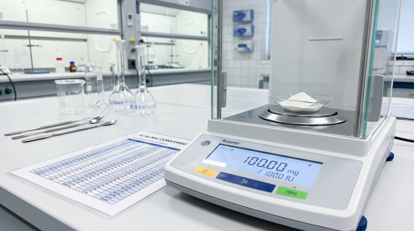 Laboratory precision scale measuring supplement powder with IU to mg conversion reference